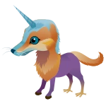 Camphruch is an ungulate with a orange, dog-like head, no ears, eyes with gray sclera, a light-gray snouth and forehead, a single long horn on its head, a gray body, black hooves on the front, bird-like, yellow feet on the back, and a horse-like tail.