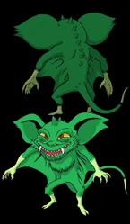 In the 2007 anime, Gremlins are small bat-like yōkai with green fur, large heads and ears, squashed noses, short spikes protrude from their head down to their backs and skin flaps between their arms and legs. They also have tails that fade to a lighter green, this also applies to their arms and legs, having hands with five fingers and feet with two toes. Their eyes have yellow sclerae, red irises and black pupils while their mouths have sharp white teeth and a pair of protruding fangs.