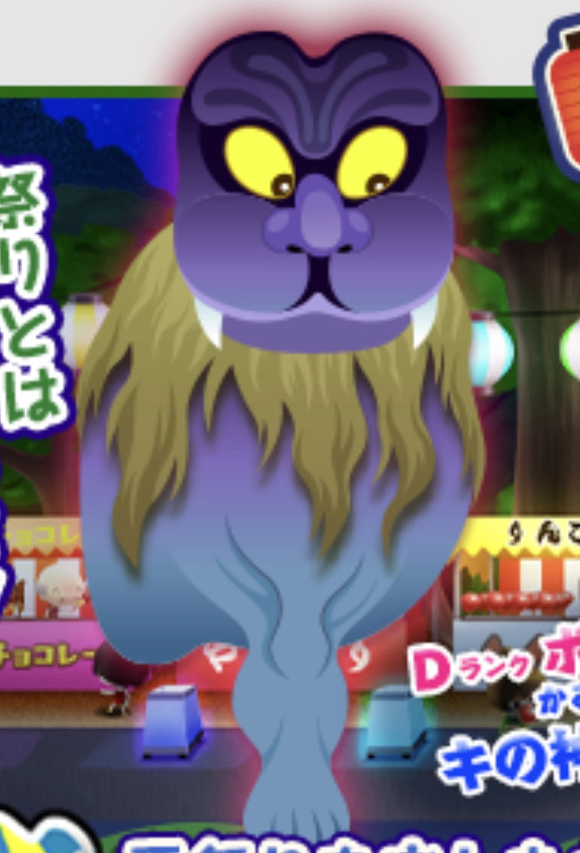 Ki-no-Kami is a creature with purple skin, a cat-like head with no ears, oval-shaped eyes with yellow sclera, a mouth with fangs, brown hair covering their neck, and a single, human-like foot.