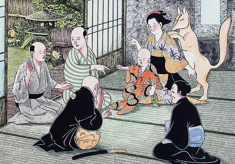 In another Kitsune-Tsuki story, when medicine, prayers, and even putting fried tofu outside the house didn't work, a gambler brought a pile of salted tuna meat, smeared it all over the possessed person's body, tied him up to a pillar in his house, and brought a dog, which licked him up and down. Since kitsune hate dogs, the man began to shake all over and screamed loudly, until finally the kitsune left.