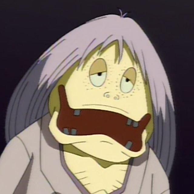 In the 1996 anime, Nando-Babaa appears as a strange old lady, with bright. yellow skin, long, light-gray hair, sleepy, narrow eyes with light-gray sclera, a square-shaped mouth with blocky teeth, freckles around her eyes, and a thin build. She wears a light-gray kimono.
