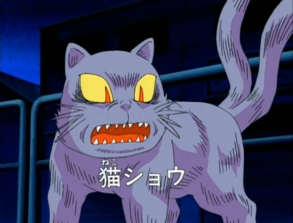 Within the 2007 anime, Neko-Shō is a cat with short purple fur, four pairs of whiskers on the side of his mouth, and eyes with green sclerae and narrow pupils. He has a light red scar over his left eye and his ears have light purple skin within them. His most notable feature are his three tails, and his only article of clothing is the dull brown cloth that he uses as a robe. After being defeated, he becomes a normal cat again, having gray fur.[1]