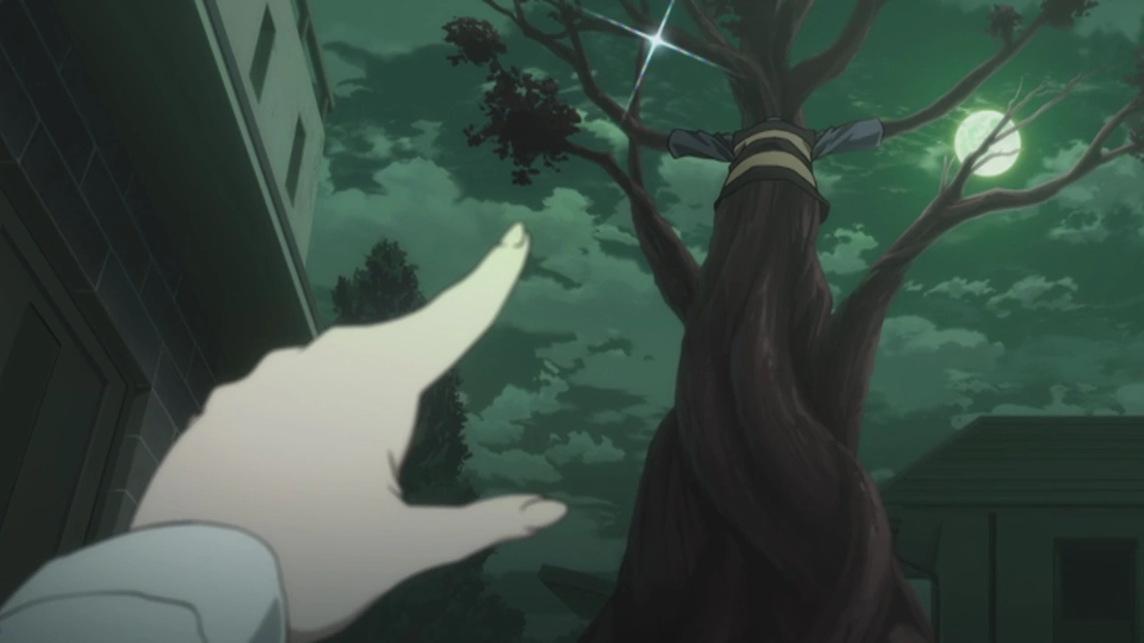 Hours go by, and Kitarō's flower blossoms into a fruit that grows bigger, all while more people are being turned into Vampire Trees. Mana asks Medama-Oyaji why they help humans, which he tells her that a man named Mizuki cared for Kitarō when he was a baby. So in a way, Kitarō saves humans in order to repay the debt. They hear something drop outside and find Kitarō coming out of a giant fruit naked. He apologizes to his father for making him worry, but Medama-Oyaji forgives him as he was confident that his son was alright. Kitarō assumed that more people turned into trees while he could not move, and his father confirms this. As they walk off to resume their fight with the Nobiagari, Mana begins to follow them. Kitarō stops Mana from coming again but is still unable to change her mind. They go back to the underground reservoir, finding that the construction had stopped likely because of the Nobiagari. It returns while they hide and Mana is finally able to see it. Medama-Oyaji claims that this is because she is beginning to believe in yōkai. Kitarō attacks the Nobiagari with his geta followed by his hair needles, but it isn't effective. It manages to grab Kitarō's leg and drags him towards itself. Mana tries to save him but slips on a bottle that causes a chain reaction that ends with a hook hitting the Nobiagari in the eye, causing it pain and making it escape. With this, Kitarō realizes that its eye is its weakness. He cuts the Nobiagari off and hits its eye with his Spirit Hair Chanchanko, making it escape again. It approaches Mana just outside of the construction site, but Kitarō arrives and fires his Hair Needles at the eye, following it up with another geta attack. Kitarō fires a Finger Gun to finish it off, causing it to explode. Since the Nobiagari has been defeated, the people who turned into Vampire Trees return to normal. Mana hugs Kitarō for defeating it. A mysterious figure from afar shoots Kitarō in the back with an arrow and causes him to collapse, prompting Mana to scream.