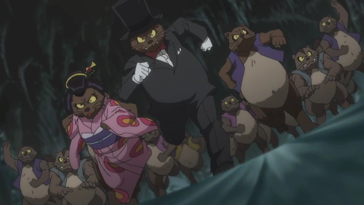 Simultaneously, Gyōbu-Danuki senses them coming for the Kaname Stone, sending Danichirō to defend the stone. The rest of the tanuki and Nezumi-Otoko chase after them, to prevent them from getting to the Kaname Stone. Ittan-Momen decides to stall them, allowing the others to go ahead, he swoops around several tanuki and warns the others that he will strangle one. They disregard him, however, as Dansaburō breaks free, letting the others go ahead as he plans to make Ittan-Momen into a loincloth. They catch up to the others, where Konaki-Jijii and Sunakake-Babaa decide to fend them off, letting Mana and Neko-Musume get to the stone. Sunakake-Babaa uses her paralysis sand to stops most of them, as Konaki-Jijii faces off against Dansaburō and Sunakake-Babaa against Danjirō. She manages to break her pin, while Konaki-Jijii immobilizes Dansaburō. Before the others could go, Sunakake-Babaa uses her Sand Drum, causing a wave of sand to hurl them with tremendous force. It reaches up to Gyōbu-Danuki, as Nezumi-Otoko informs him that they are getting close to the Kaname Stone and that Mana is with them. He worries as the curse does not affect humans, but remembers that he placed a spell on her. Neko-Musume and Mana find Kitarō and the stone, as Danichirō transforms and clashes with Neko-Musume.