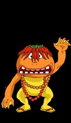 Shichimi is a short yōkai resembling a kappa with orange skin, short red chili peppers in place of hair, and webbed hands. He has small eyes with black pupils, a small nose, pink lips, and flat teeth. He wears a tight, yellow one-piece that covers his body, legs, and feet, and a pair of light yellow sandals with red laces.[2]