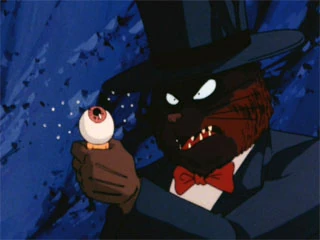 In the manga, Genba Danuki is a large, bipedal tanuki with round, angry eyes, sharp teeth, and thin whiskers. He wears a tall dark top hat, white gloves, and a formal suit and tie.