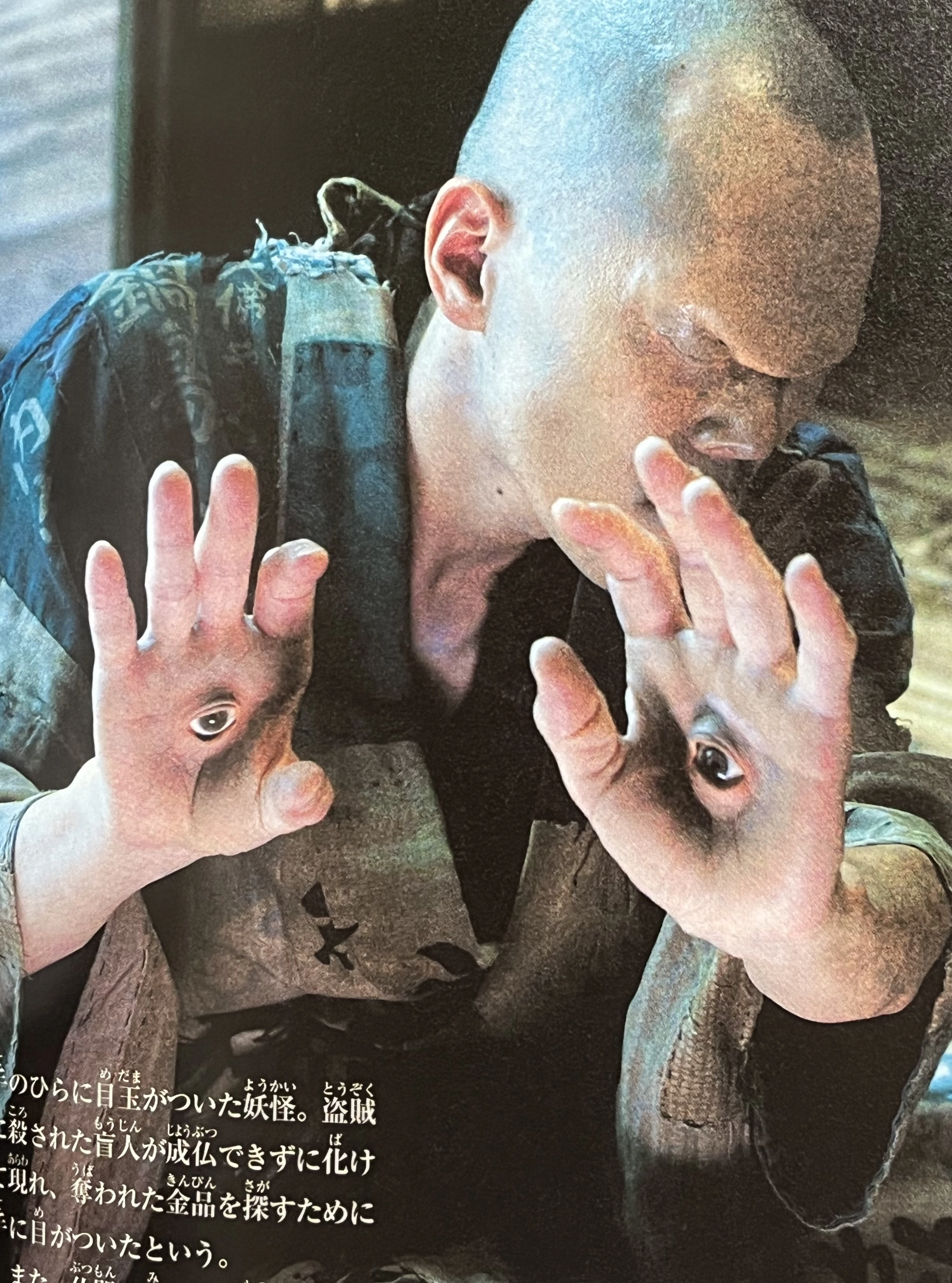 Te-no-Me (手の目 Tenome, lit. Eyes on Hand) is a human-like yōkai with eyes on his hands instead of on his face.