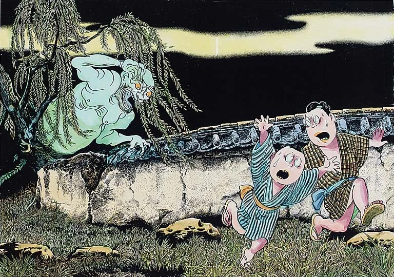 The next day, with bloodshot eyes and disheveled hair, the couple complained to their neighbors: "Something keeps making 'Uwan' noises all night long, making it impossible for anyone to sleep." None of the neighbors heard the sound, and no one believed it. The couple huddled together in fear all night, their eyes red from exhaustion, only to be ridiculed by others. The next day, a single elder in the village heard the news and told them. “A yōkai called 'Uwan' has lived in that old house for a long time. The sound you heard must be the work of Uwan’.”