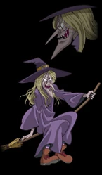 In the manga, Witch resembles most modern and traditional images of witches, with a long black cloak and large, pointy hat. She has a face with large, angry eyes, a smiling mouth with sharp teeth, a long, pointy nose, a triangular chin, and long hair. In the story, The Witch's Doll, she is shown to have teal skin.
